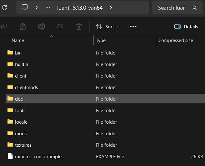 In plaats van een installer voor de launcher van het spel, komt Luanti met de gehele launcher in de ZIP bestand dat je download. Ik moest even zoeken waar de .exe was, maar die was makkelijk te vinden in de bin folder.