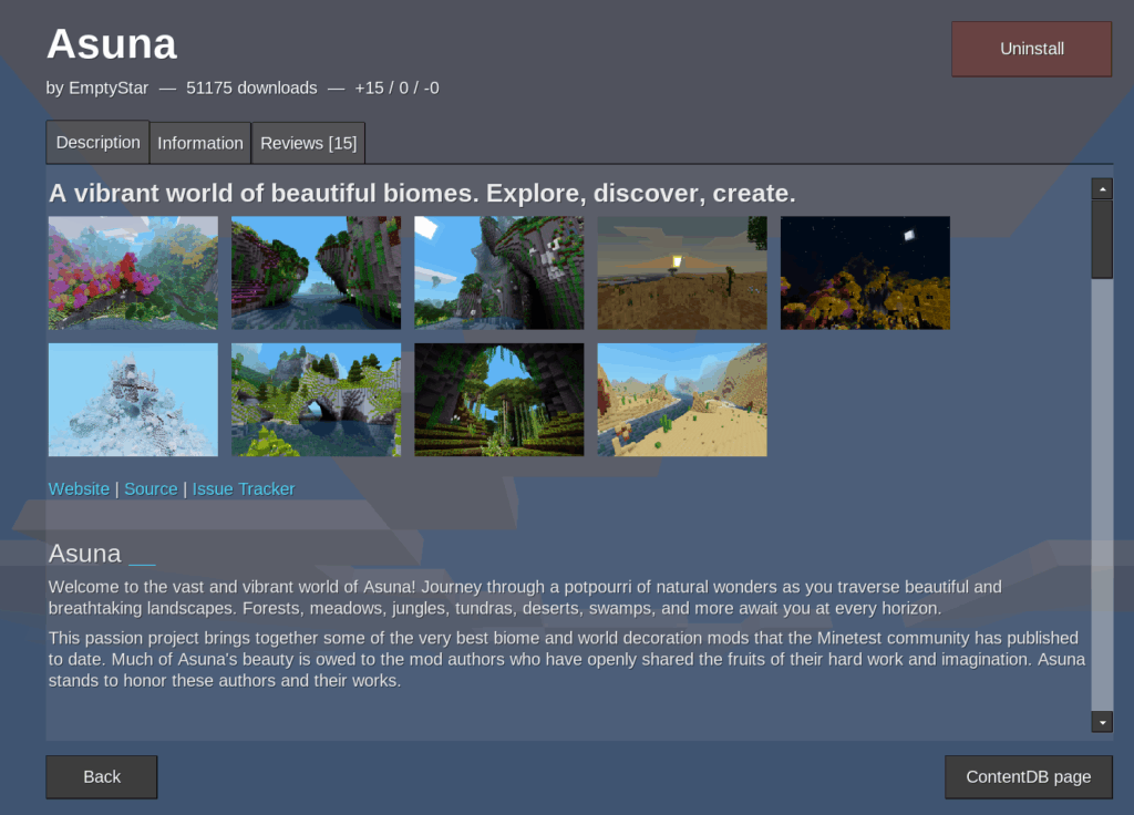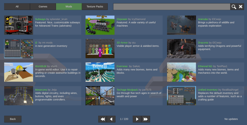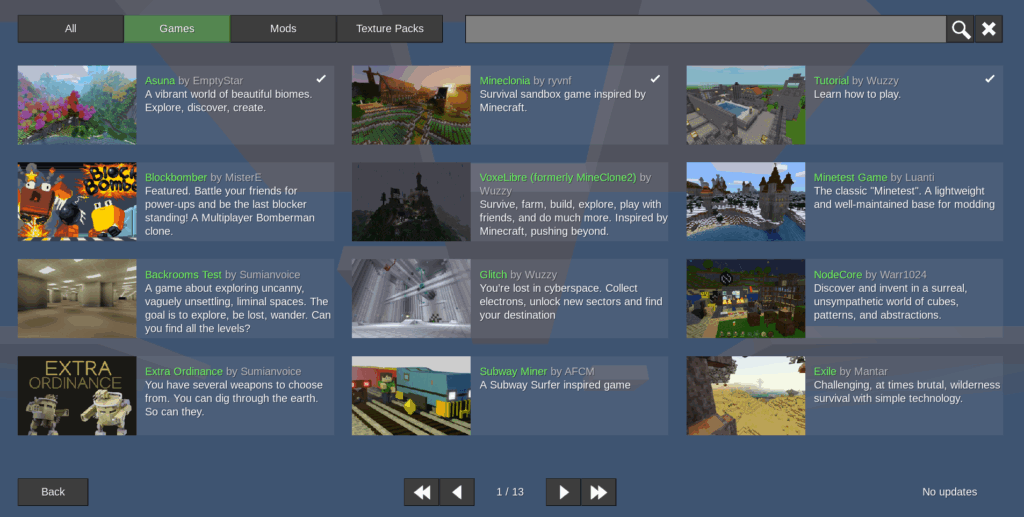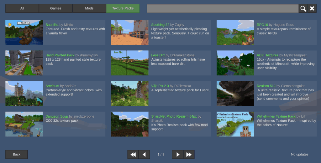 Ook kan je via de launcher verschillende texture packs en mods downloaden, deze veranderen spellen om dingen toe te voegen dat er nog niet was of om het uiterlijk van een spel te veranderen. Bij Minecraft moet je dit soort dingen van een externe bron halen, terwijl bij Luanti dit gewoon in de launcher zit.